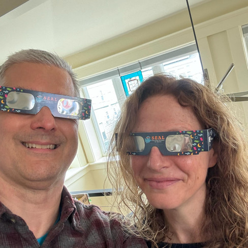 Photos, clockwise from top left: Matt and Shannon, ready for the eclipse; Matt Heaton & the Outside Toys at a Wright's Pond Concert hosted by the Medford Family Network; Medford's newest music (and sandwich) venue, Deep Cuts; the beautiful cafe at the Medford Public Library.